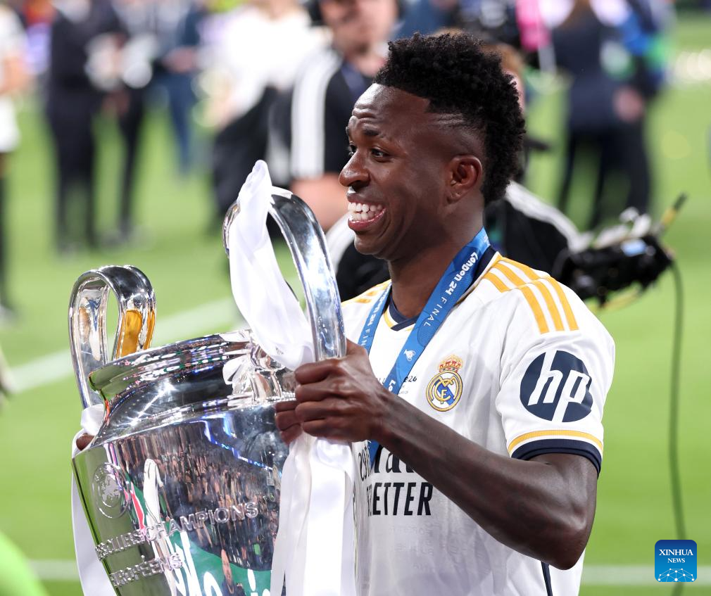 Vinicius Junior of Real Madrid celebrates with the trophy after winning the UEFA Champions League final match between Real Madrid and Borussia Dortmund in London, Britain, June 1, 2024. (Xinhua/Str)