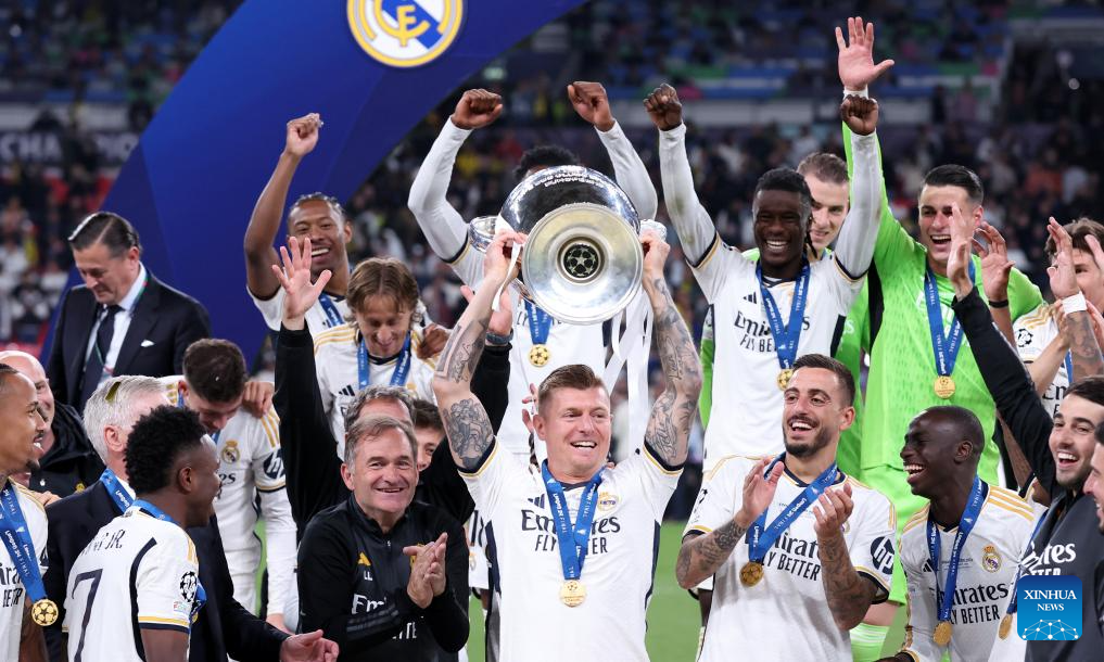 Toni Kroos (bottom C) of Real Madrid celebrates with the trophy after winning the UEFA Champions League final match between Real Madrid and Borussia Dortmund in London, Britain, June 1, 2024. (Xinhua/Str)