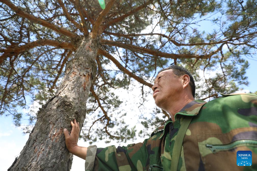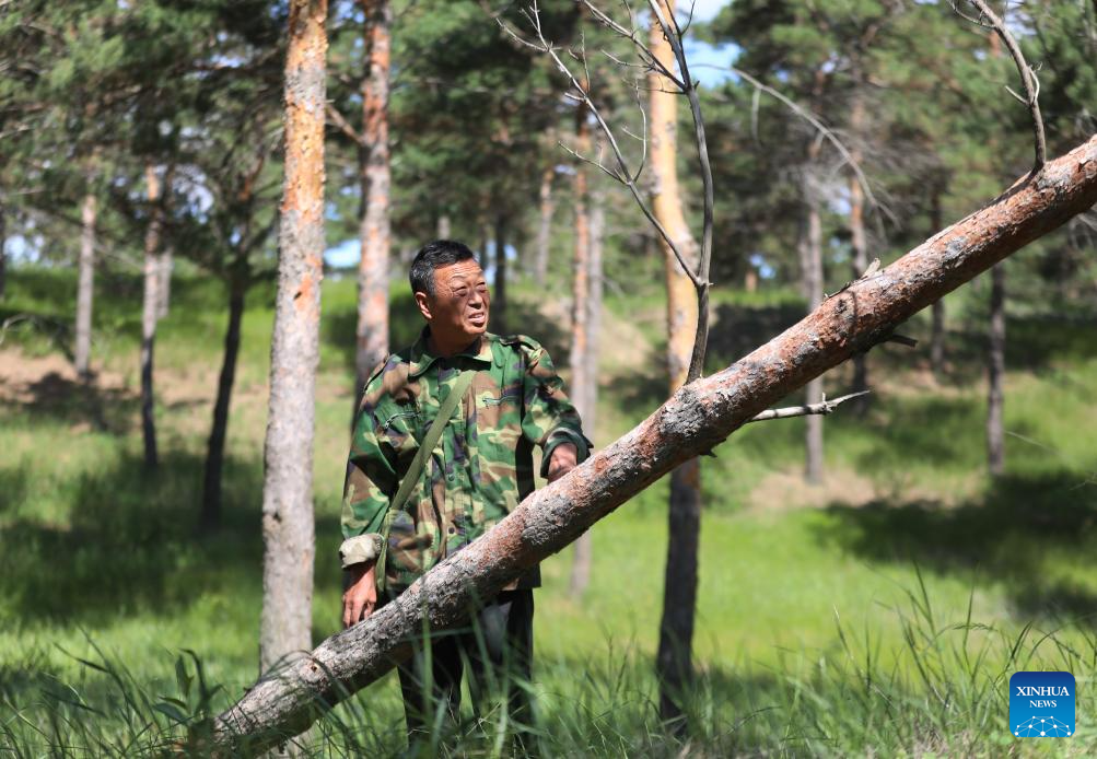 Li Dongkui checks a fallen pine tree in Zhangwu County, northeast China's Liaoning Province, May 31, 2024. (Xinhua/Yang Qing)
