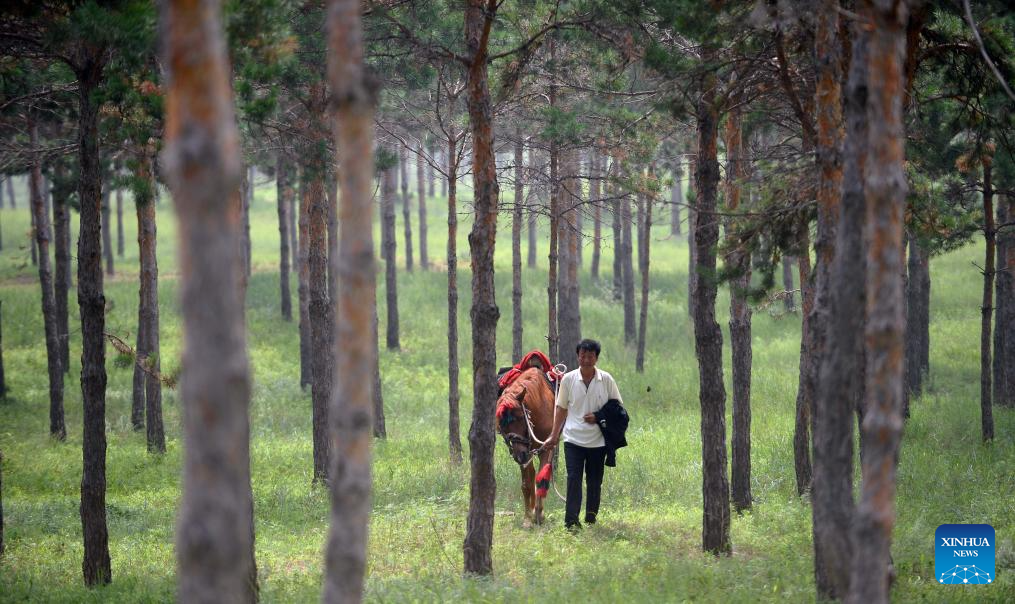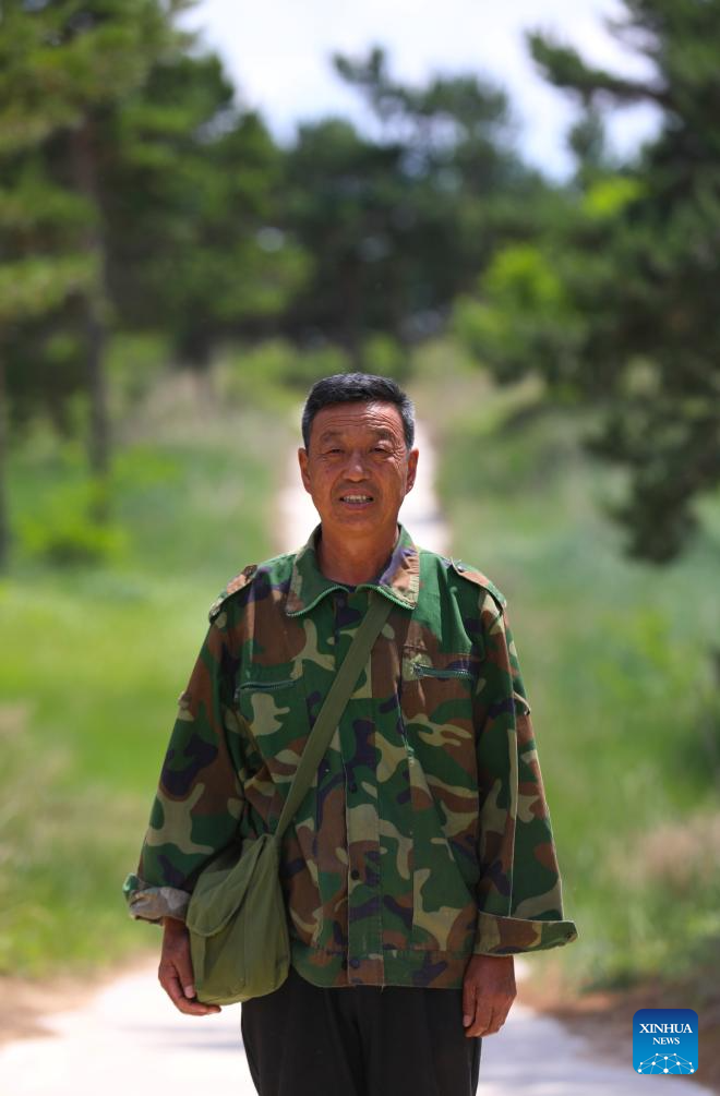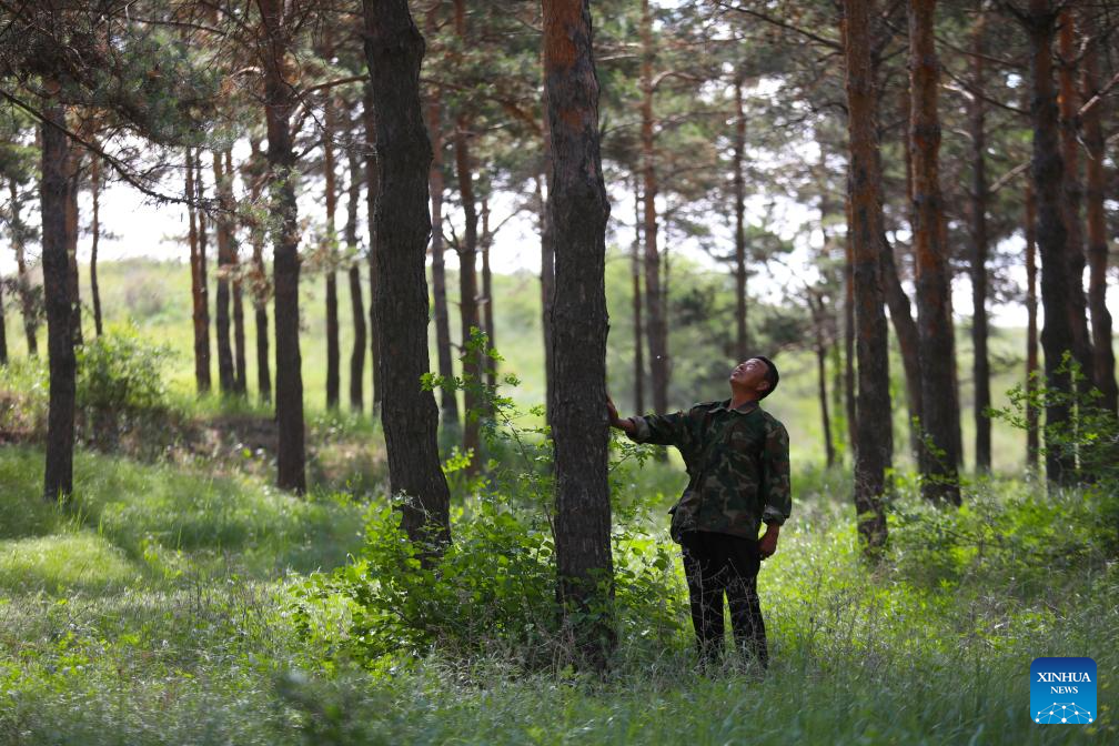 Li Dongkui checks the growth of pine trees in Zhangwu County, northeast China's Liaoning Province, May 31, 2024. (Xinhua/Yang Qing)