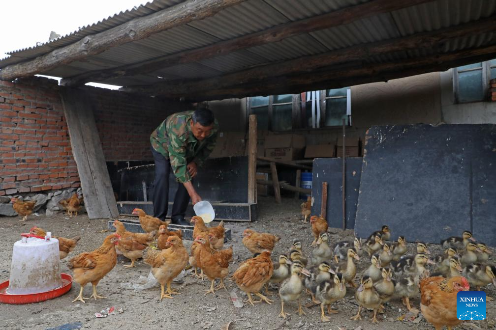Li Dongkui feeds chicken at home in Zhangwu County, northeast China's Liaoning Province, May 30, 2024.