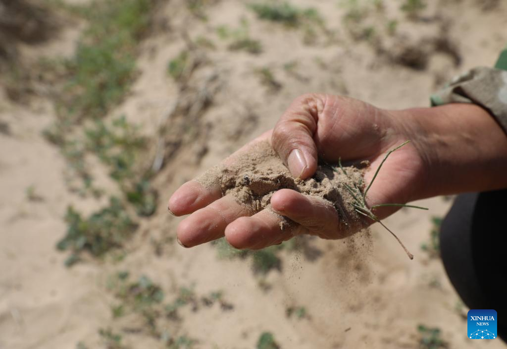 Li Dongkui checks the growth of weeds on sandy land in Zhangwu County, northeast China's Liaoning Province, May 31, 2024. (Xinhua/Yang Qing)