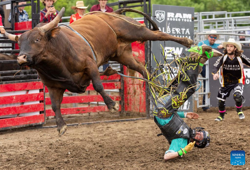 A cowboy competes in the bull riding event at the 2024 RAM Rodeo Tour in Brooklin, Ontario, Canada, June 2, 2024. (Photo by Zou Zheng/Xinhua)