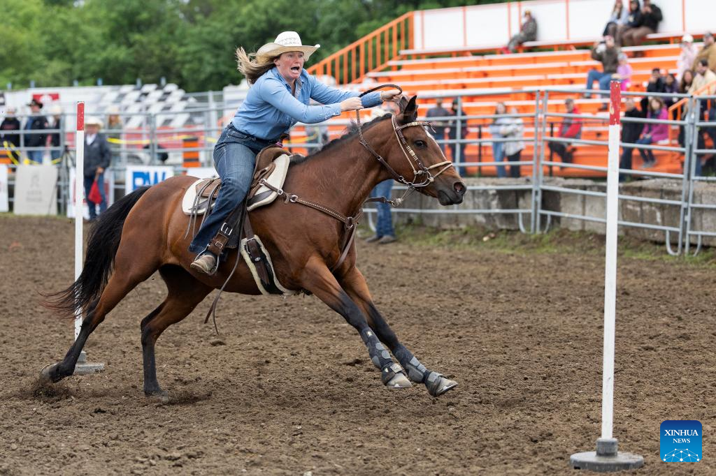 A cowgirl competes in the pole racing event at the 2024 RAM Rodeo Tour in Brooklin, Ontario, Canada, June 2, 2024. (Photo by Zou Zheng/Xinhua)