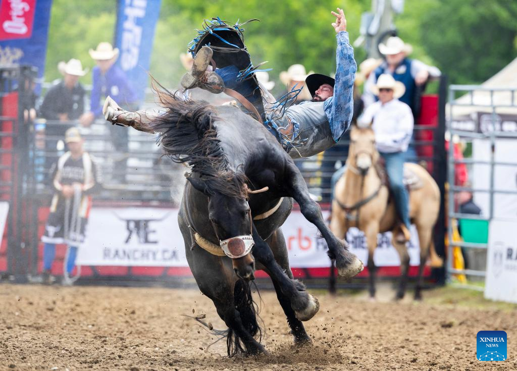 A cowboy competes in the bareback riding event at the 2024 RAM Rodeo Tour in Brooklin, Ontario, Canada, June 2, 2024. (Photo by Zou Zheng/Xinhua)
