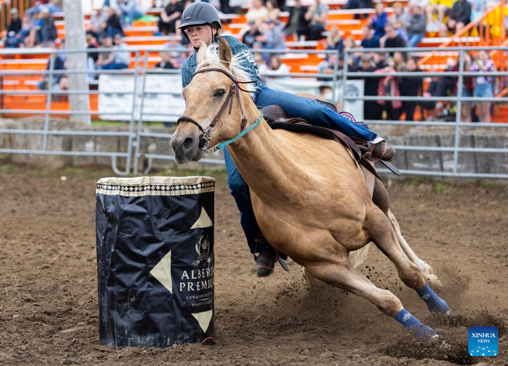 A cowgirl competes in the barrel racing event at the 2024 RAM Rodeo Tour in Brooklin, Ontario, Canada, June 2, 2024. (Photo by Zou Zheng/Xinhua)