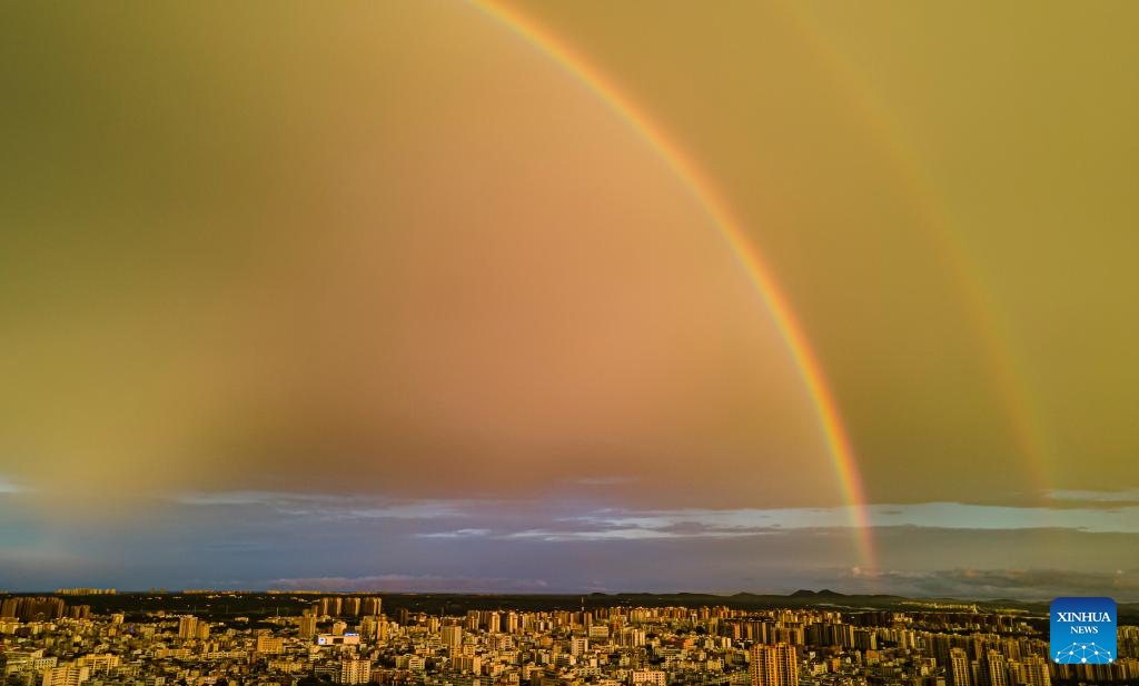 A drone photo taken on June 2, 2024 shows a rainbow above Qionghai City, south China's Hainan Province. (Photo by Meng Zhongde/Xinhua)