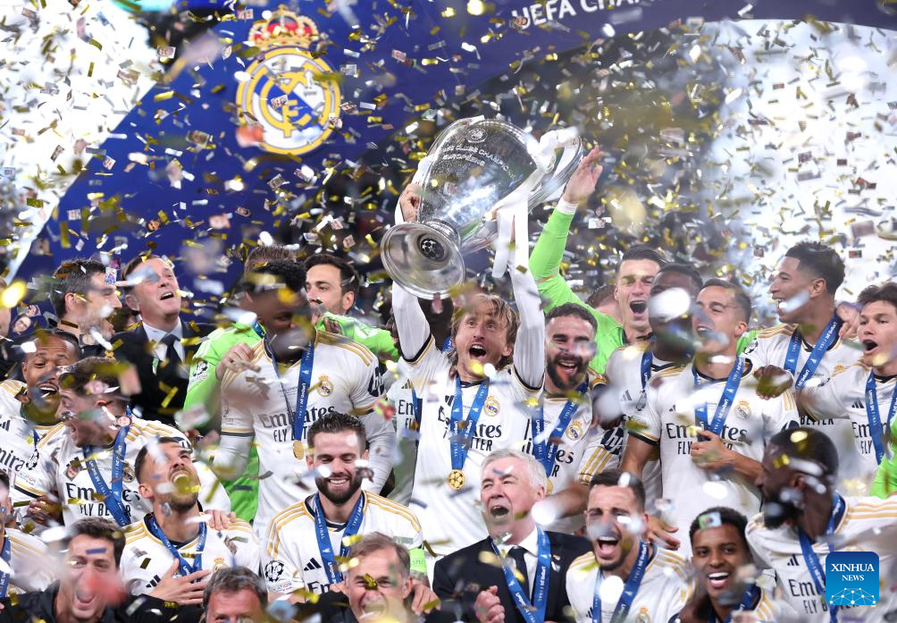 Team members of Real Madrid celebrate with the trophy after winning the UEFA Champions League final match between Real Madrid and Borussia Dortmund in London, Britain, June 1, 2024. (Xinhua/Str)