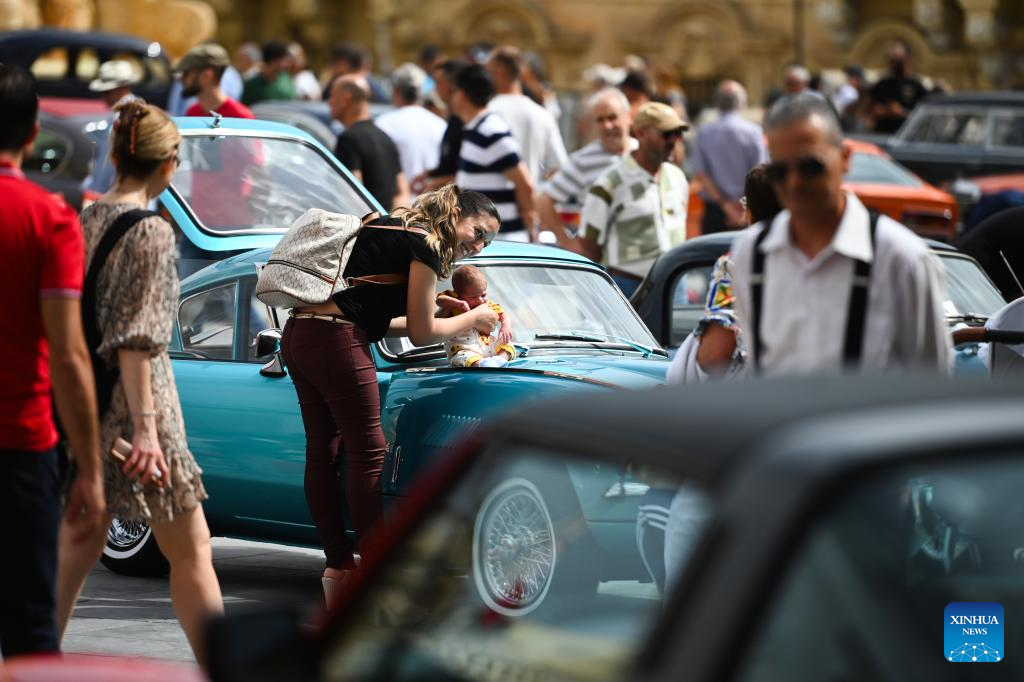 People visit a show of vintage and classic cars at St. George's Square in Valletta, Malta, June 2, 2024. (Photo by Jonathan Borg/Xinhua)