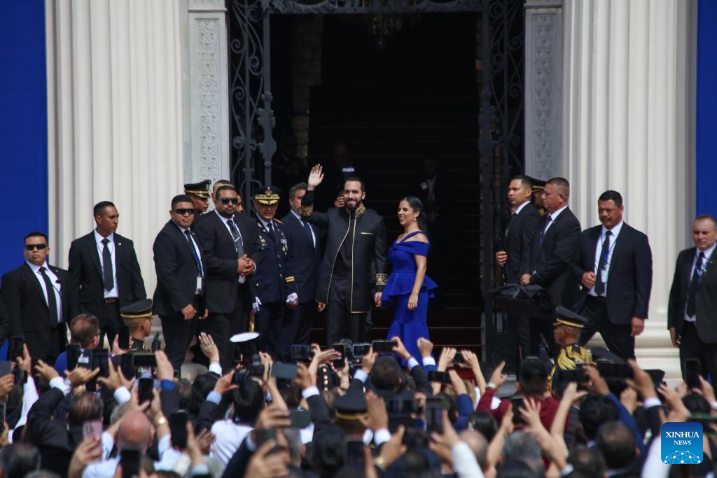 El Salvador's President Nayib Bukele waves during the inauguration ceremony at the National Palace in San Salvador, El Salvador, June 1, 2024. The inauguration ceremony of the second term of El Salvador's President Nayib Bukele was held in San Salvador on Saturday. (Photo by Alexander Pena/Xinhua)