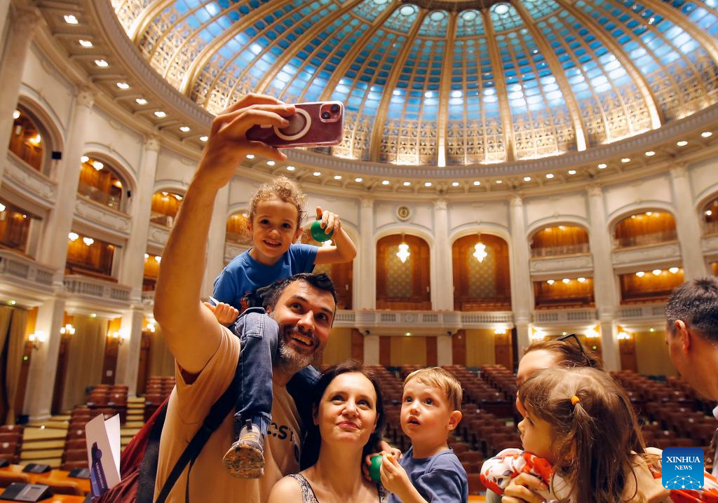 A family take selfies inside the main hall of the Deputy Chamber during an open-door event marking the International Children's Day at Romania's Parliament Palace in Bucharest, Romania, June 1, 2024. (Photo by Cristian Cristel/Xinhua)