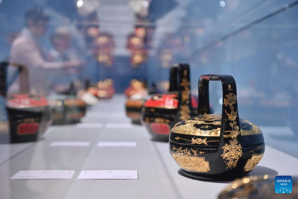 Visitors watch lacquer baskets during an exhibition of Maritime Silk Road intangible cultural heritage artwork from Yongchun County of Quanzhou City of southeast China's Fujian Province, at the National Art Museum of China in Beijing, capital of China, June 2, 2024. (Xinhua/Song Weiwei)
