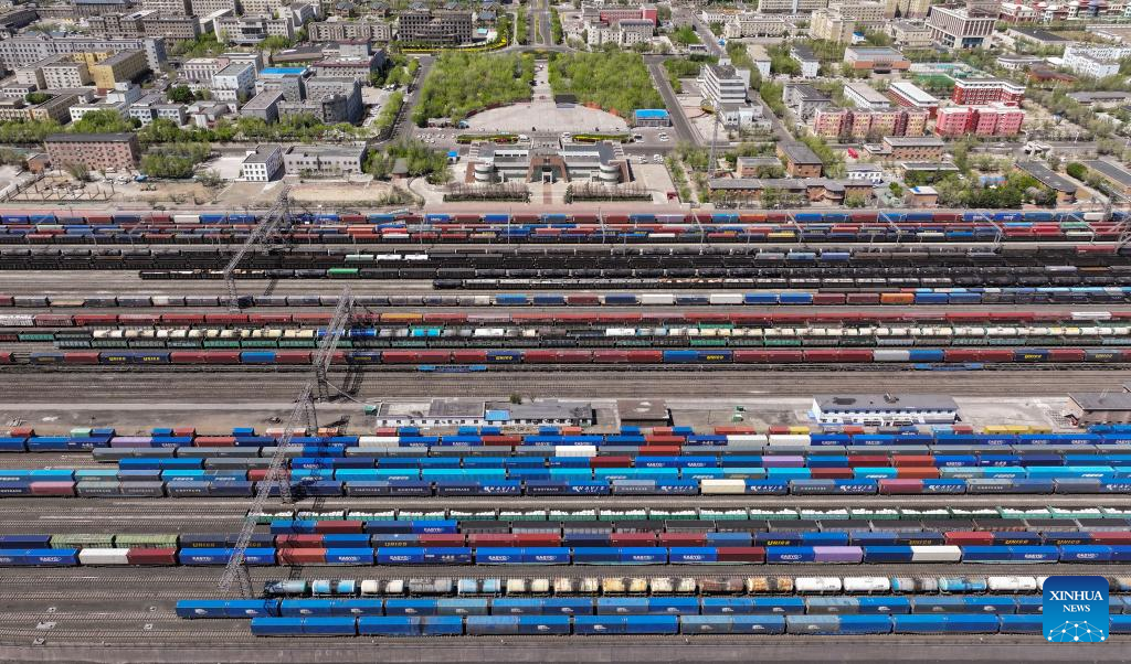 A drone photo taken on May 25, 2024 shows freight trains waiting for departure at the Alataw Pass in northwest China's Xinjiang Uygur Autonomous Region. The Horgos Port and the Alataw Pass, two major railway ports in northwest China's Xinjiang Uygur Autonomous Region, have handled more than 6,400 China-Europe (Central Asia) freight train trips since the beginning of this year, according to China Railway Urumqi Group Co., Ltd. (Photo by Yu Hui/Xinhua)