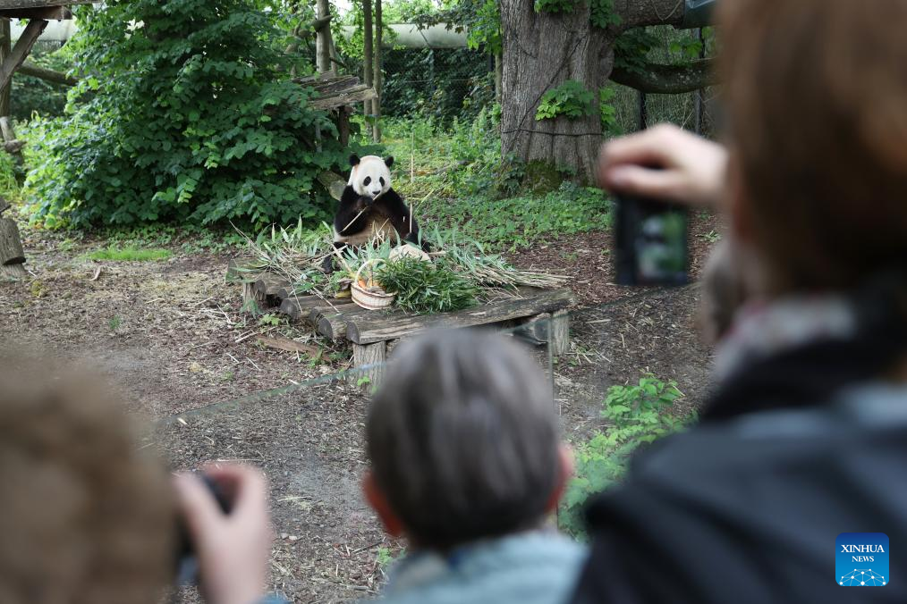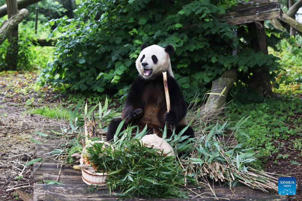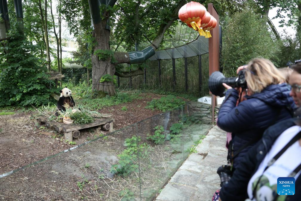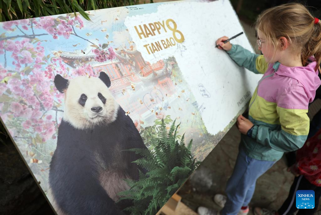 The Belgian Pairi Daiza Zoo celebrated the 8th birthday of giant panda Tian Bao on Sunday. (Xinhua/Zhao Dingzhe)
