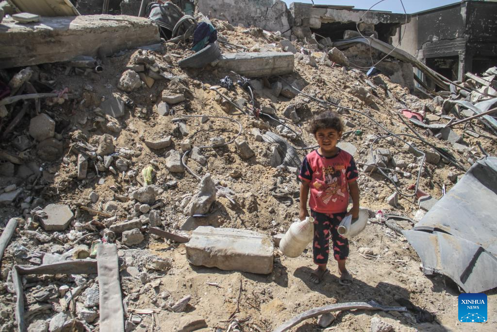 A girl holding empty bottles is pictured near the rubble at the Jabalia refugee camp in the northern Gaza Strip, on June 2, 2024. The Israeli army has withdrawn from the Jabalia refugee camp in the northern Gaza Strip after nearly three weeks of military operation there, Palestine TV reported on Friday. (Photo by Mahmoud Zaki/Xinhua)