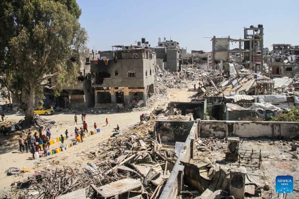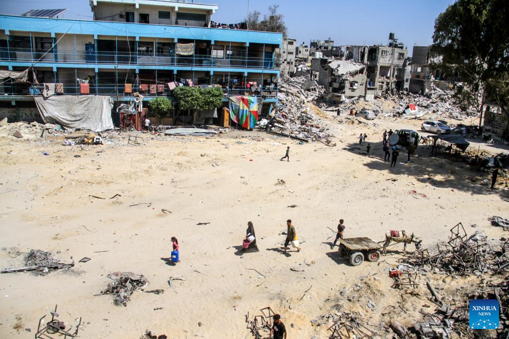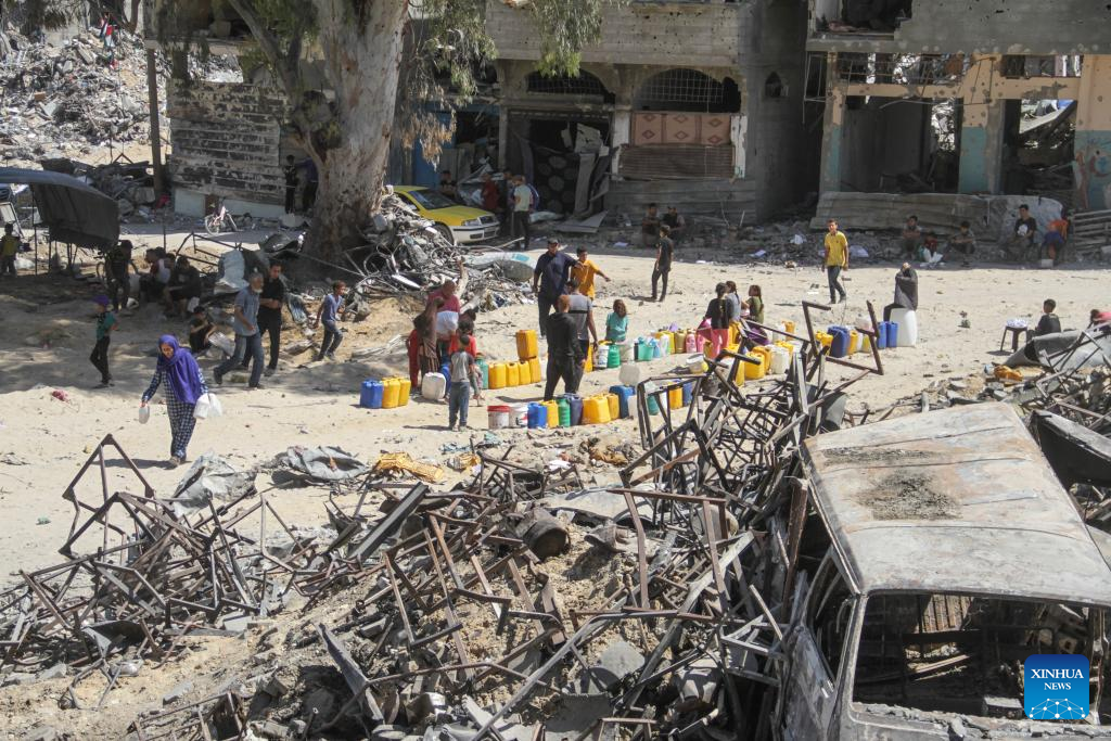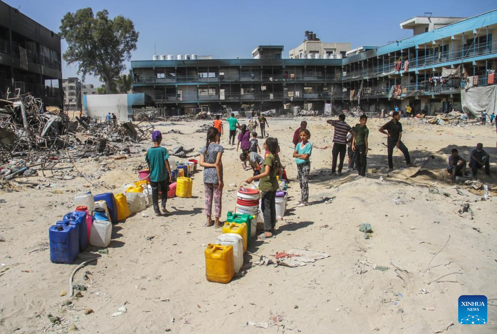 People wait to fetch water inside a school at the Jabalia refugee camp in the northern Gaza Strip, on June 2, 2024. The Israeli army has withdrawn from the Jabalia refugee camp in the northern Gaza Strip after nearly three weeks of military operation there, Palestine TV reported on Friday. (Photo by Mahmoud Zaki/Xinhua)