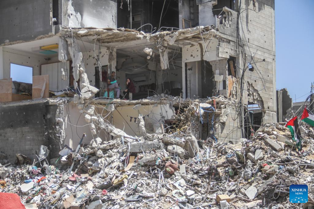 People sit in a destroyed house at the Jabalia refugee camp in the northern Gaza Strip, on June 2, 2024. The Israeli army has withdrawn from the Jabalia refugee camp in the northern Gaza Strip after nearly three weeks of military operation there, Palestine TV reported on Friday. (Photo by Mahmoud Zaki/Xinhua)