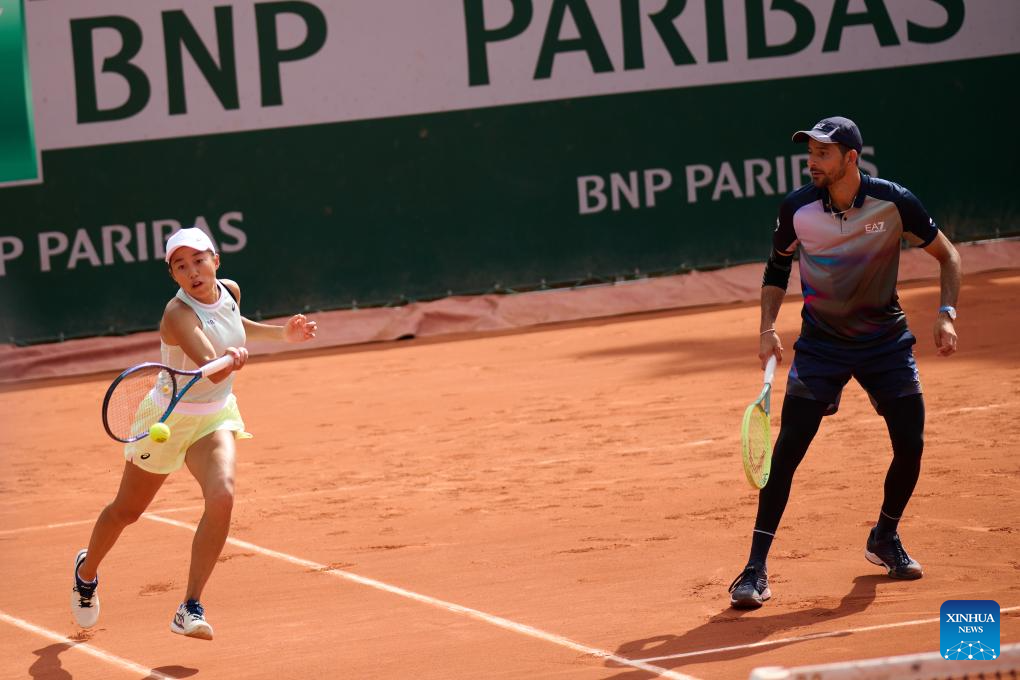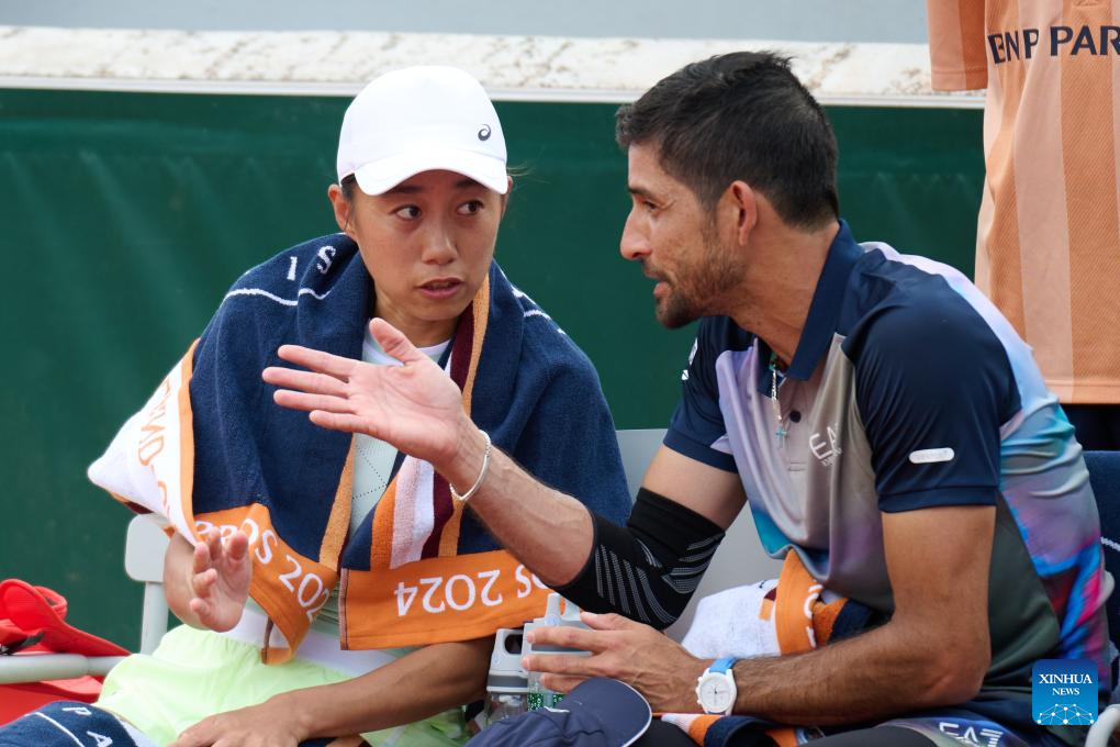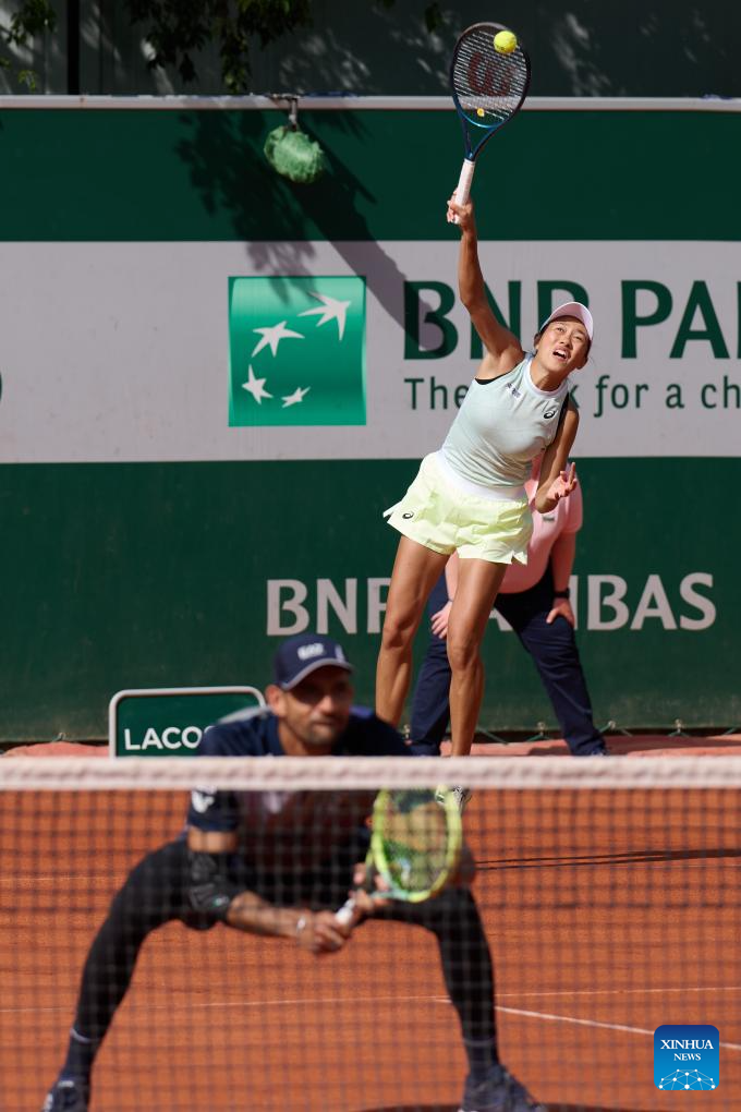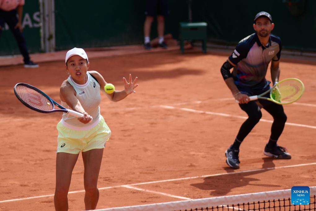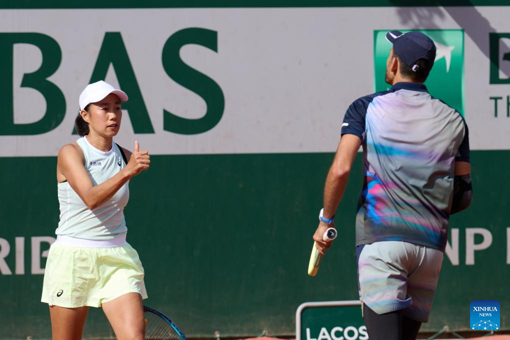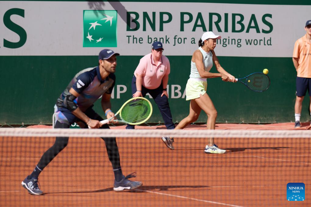 Zhang Shuai (L)/Marcelo Arevalo compete during the mixed doubles second round match between Zhang Shuai (China)/Marcelo Arevalo (El Salvador) and Asia Muhammad(USA)/Ariel Behar(Uruguay) at the French Open tennis tournament at Roland Garros in Paris, France, June 3, 2024. (Xinhua/Meng Dingbo)