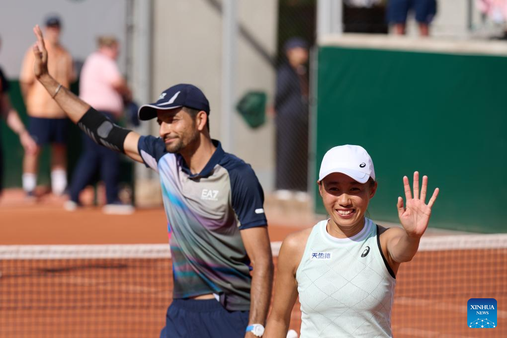 Zhang Shuai (L)/Marcelo Arevalo celebrate the victory after the mixed doubles second round match between Zhang Shuai (China)/Marcelo Arevalo (El Salvador) and Asia Muhammad(USA)/Ariel Behar(Uruguay) at the French Open tennis tournament at Roland Garros in Paris, France, June 3, 2024. (Xinhua/Meng Dingbo)
