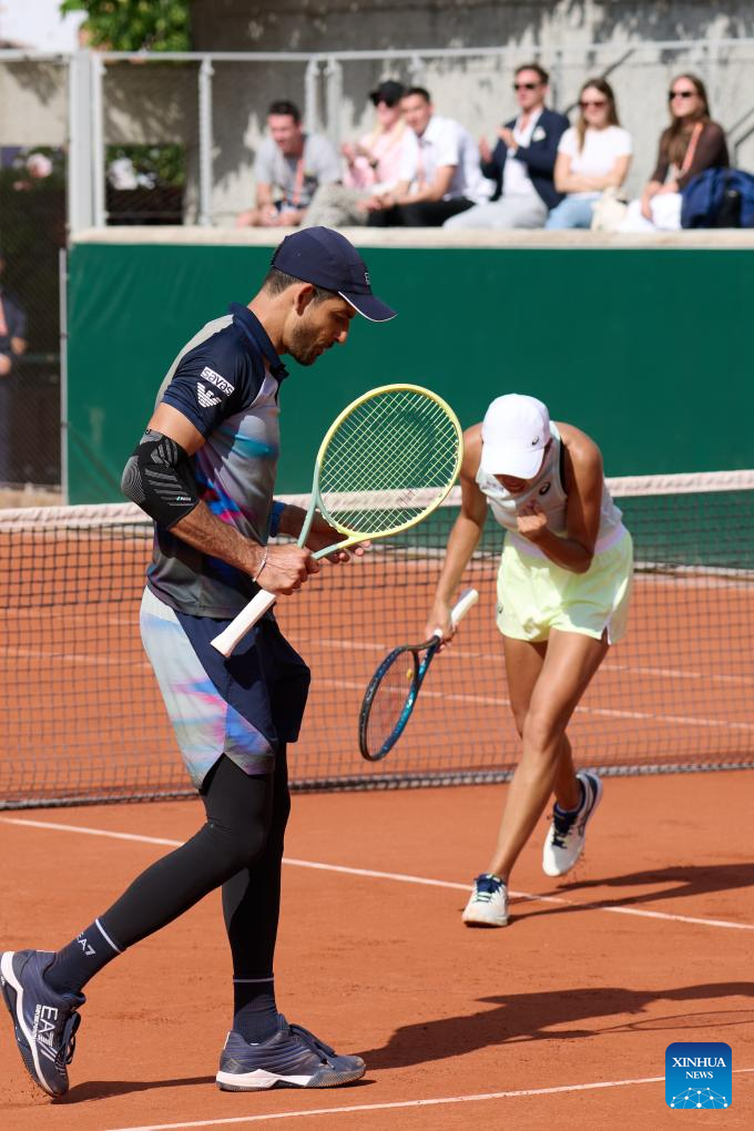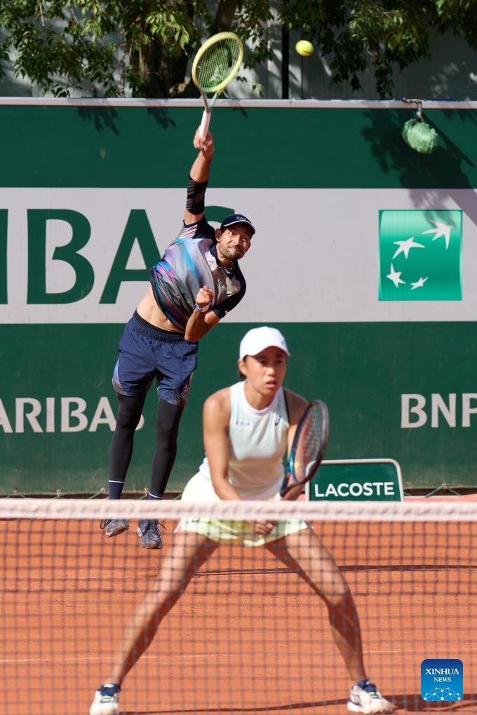 Zhang Shuai (R)/Marcelo Arevalo compete during the mixed doubles second round match between Zhang Shuai (China)/Marcelo Arevalo (El Salvador) and Asia Muhammad(USA)/Ariel Behar(Uruguay) at the French Open tennis tournament at Roland Garros in Paris, France, June 3, 2024. (Xinhua/Meng Dingbo)