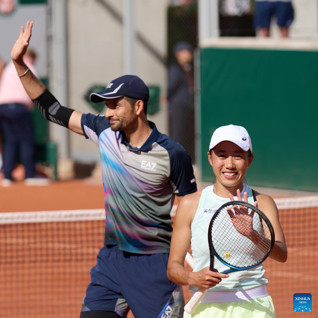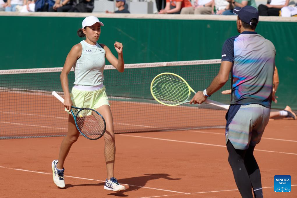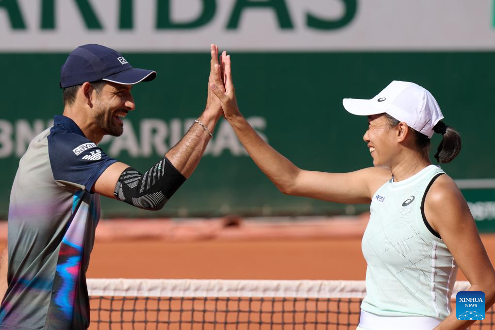 Zhang Shuai (R)/Marcelo Arevalo celebrate the victory after the mixed doubles second round match between Zhang Shuai (China)/Marcelo Arevalo (El Salvador) and Asia Muhammad(USA)/Ariel Behar(Uruguay) at the French Open tennis tournament at Roland Garros in Paris, France, June 3, 2024. (Xinhua/Meng Dingbo)