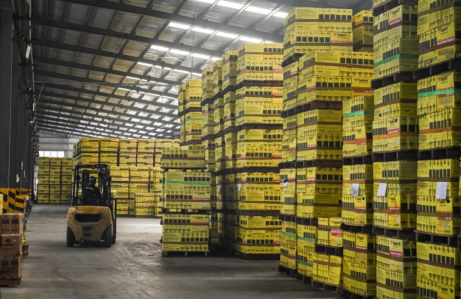 A forklift transfers tile packages at the KEDA (Kenya) ceramics factory in Kajiado County, Kenya, on May 17, 2024. (Xinhua/Li Yahui)