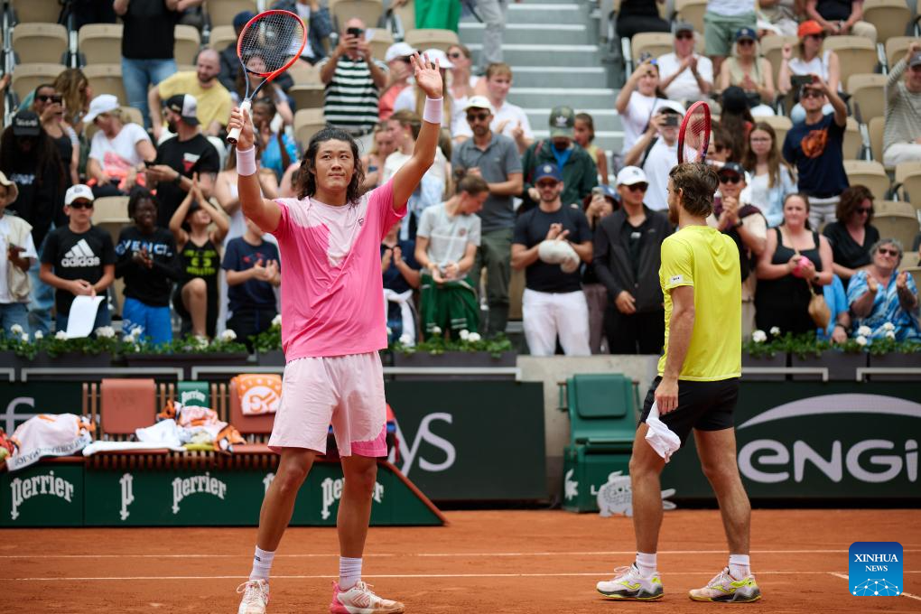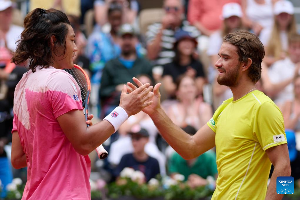 Zhang Zhizhen (L) and Tomas Machac celebrate after the men's doubles 3rd round match between Zhang Zhizhen (China)/Tomas Machac (Czech Republic) and Maximo Gonzalez/Andres Molteni (Argentina) at the French Open tennis tournament at Roland Garros in Paris, France, June 4, 2024. (Xinhua/Meng Dingbo)