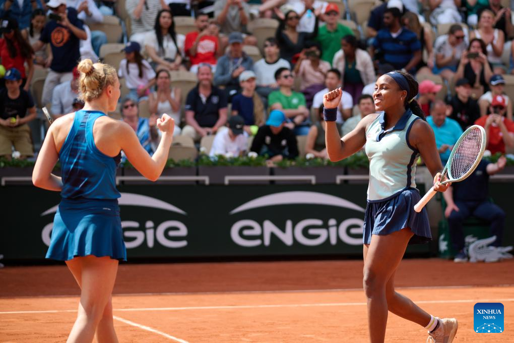Coco Gauff (R)/Katerina Siniakova celebrate scoring during the women's doubles 3rd round match between Wang Xinyu (China)/Shibahara Ena (Japan) and Coco Gauff (the United States)/Katerina Siniakova (Czech Republic) at the French Open tennis tournament at Roland Garros in Paris, France, June 4, 2024. (Xinhua/Meng Dingbo)