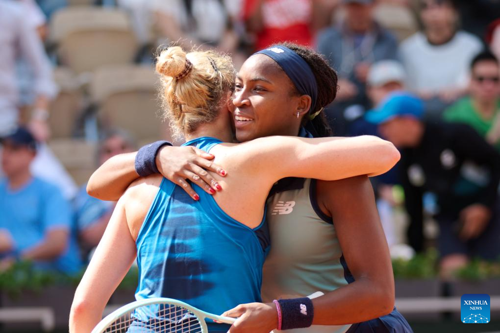 Coco Gauff (R)/Katerina Siniakova celebrate victory after the women's doubles 3rd round match between Wang Xinyu (China)/Shibahara Ena (Japan) and Coco Gauff (the United States)/Katerina Siniakova (Czech Republic) at the French Open tennis tournament at Roland Garros in Paris, France, June 4, 2024. (Xinhua/Meng Dingbo)