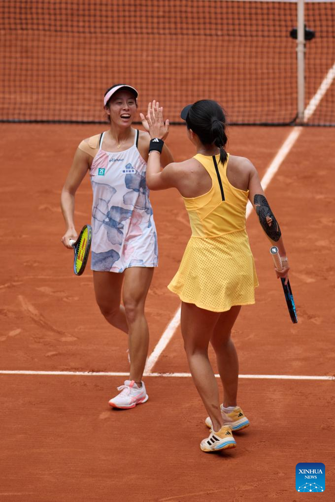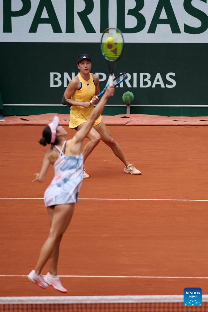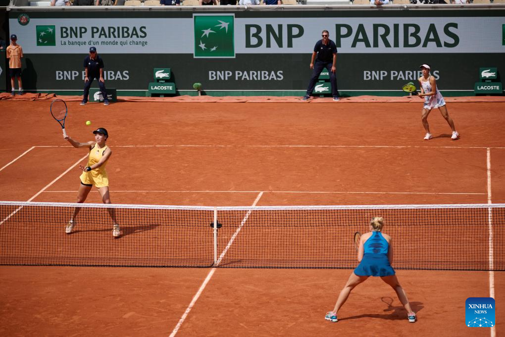 Wang Xinyu (rear)/Shibahara Ena compete during the women's doubles 3rd round match between Wang Xinyu (China)/Shibahara Ena (Japan) and Coco Gauff (the United States)/Katerina Siniakova (Czech Republic) at the French Open tennis tournament at Roland Garros in Paris, France, June 4, 2024. (Xinhua/Meng Dingbo)