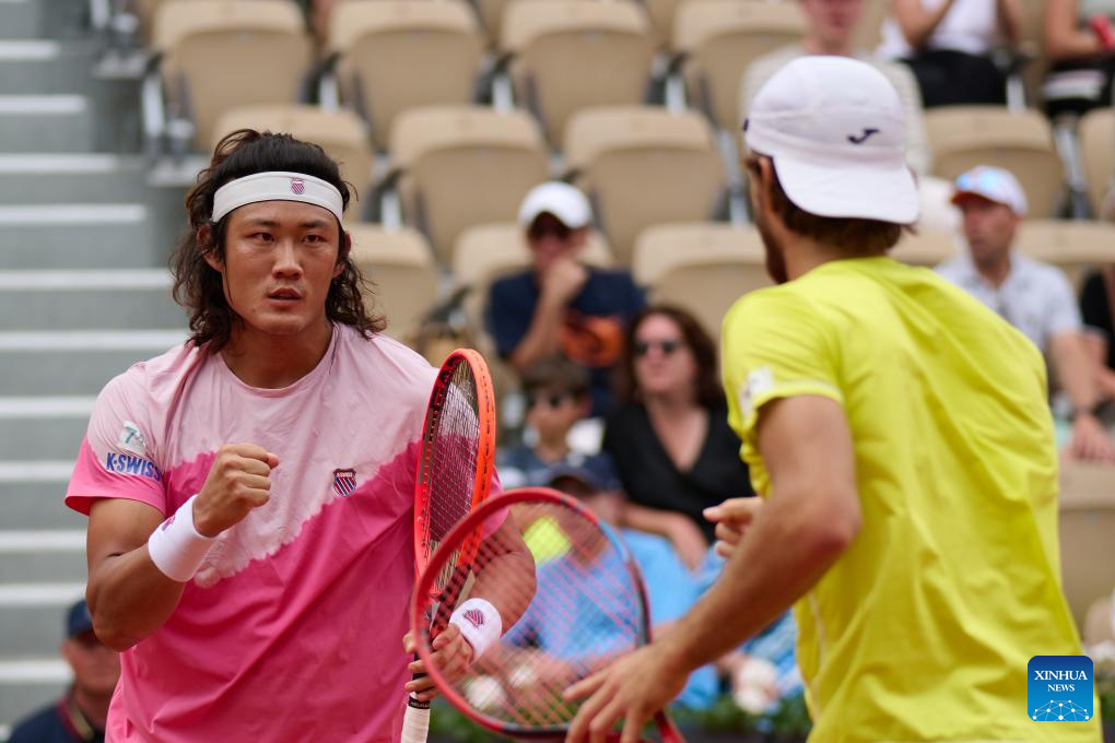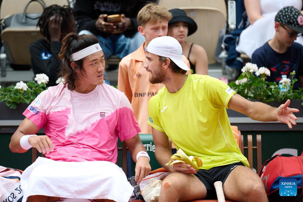 Zhang Zhizhen and Tomas Machac (L) compete during the men's doubles 3rd round match between Zhang Zhizhen (China)/Tomas Machac (Czech Republic) and Maximo Gonzalez/Andres Molteni (Argentina) at the French Open tennis tournament at Roland Garros in Paris, France, June 4, 2024. (Xinhua/Meng Dingbo)