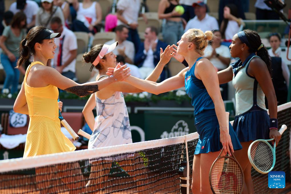 Wang Xinyu (1st L)/Shibahara Ena (2nd L) and Coco Gauff (1st R)/Katerina Siniakova greet each other after the women's doubles 3rd round match between Wang Xinyu (China)/Shibahara Ena (Japan) and Coco Gauff (the United States)/Katerina Siniakova (Czech Republic) at the French Open tennis tournament at Roland Garros in Paris, France, June 4, 2024. (Xinhua/Meng Dingbo)