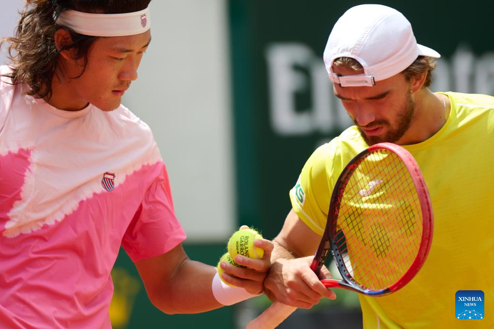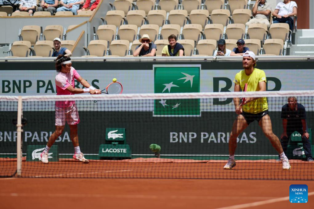 Zhang Zhizhen (L) and Tomas Machac compete during the men's doubles 3rd round match between Zhang Zhizhen (China)/Tomas Machac (Czech Republic) and Maximo Gonzalez/Andres Molteni (Argentina) at the French Open tennis tournament at Roland Garros in Paris, France, June 4, 2024. (Xinhua/Meng Dingbo)