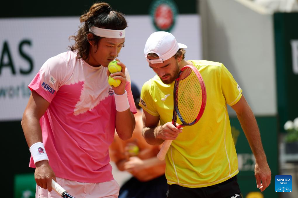 Zhang Zhizhen (L) and Tomas Machac communicate with each other during the men's doubles 3rd round match between Zhang Zhizhen (China)/Tomas Machac (Czech Republic) and Maximo Gonzalez/Andres Molteni (Argentina) at the French Open tennis tournament at Roland Garros in Paris, France, June 4, 2024. (Xinhua/Meng Dingbo)