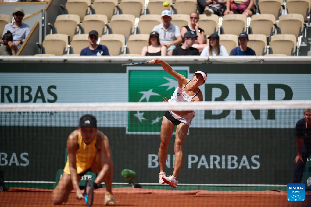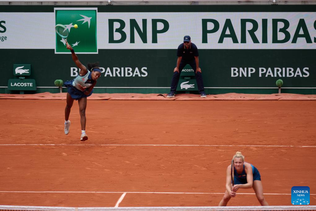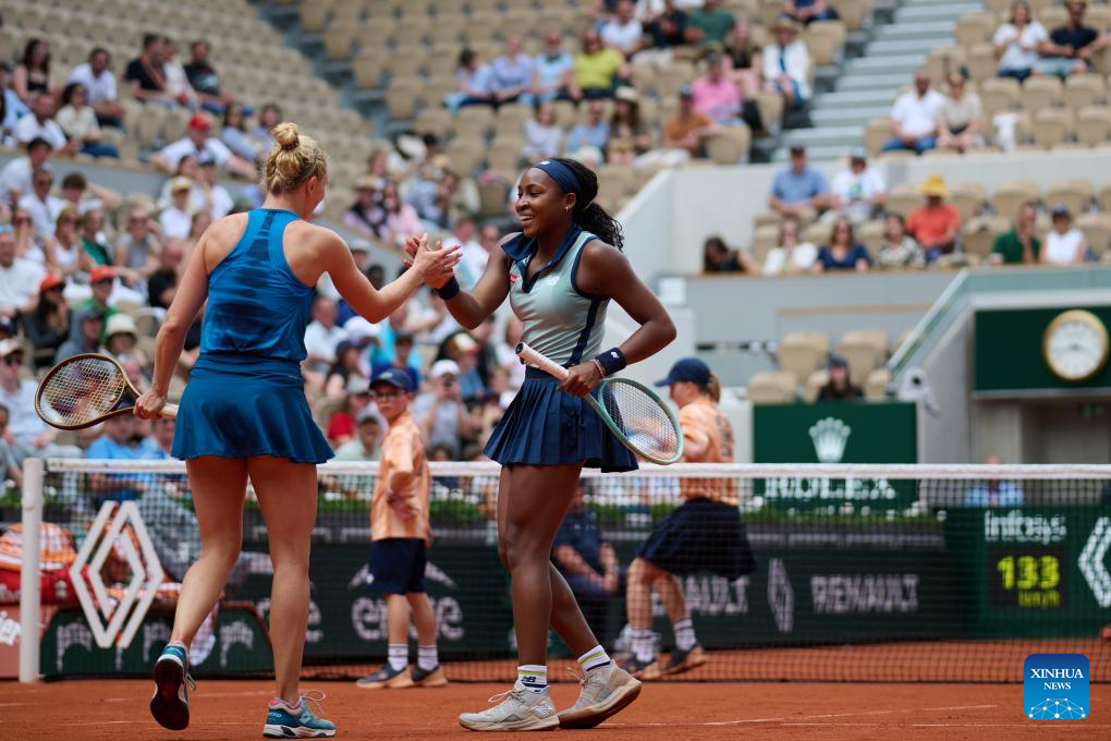 Coco Gauff (L)/Katerina Siniakova compete during the women's doubles 3rd round match between Wang Xinyu (China)/Shibahara Ena (Japan) and Coco Gauff (the United States)/Katerina Siniakova (Czech Republic) at the French Open tennis tournament at Roland Garros in Paris, France, June 4, 2024. (Xinhua/Meng Dingbo)