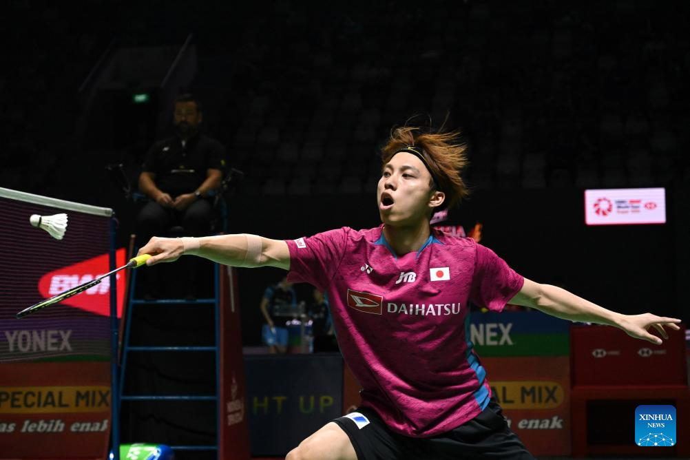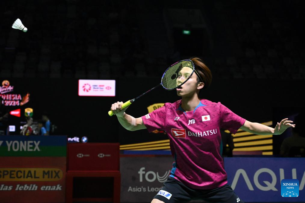 Naraoka Kodai hits a return during the men's singles first round match between Rasmus Gemke of Denmark and Naraoka Kodai of Japan at 2024 Indonesia Open badminton tournament in Jakarta, Indonesia, June 5, 2024. (Xinhua/Veri Sanovri)