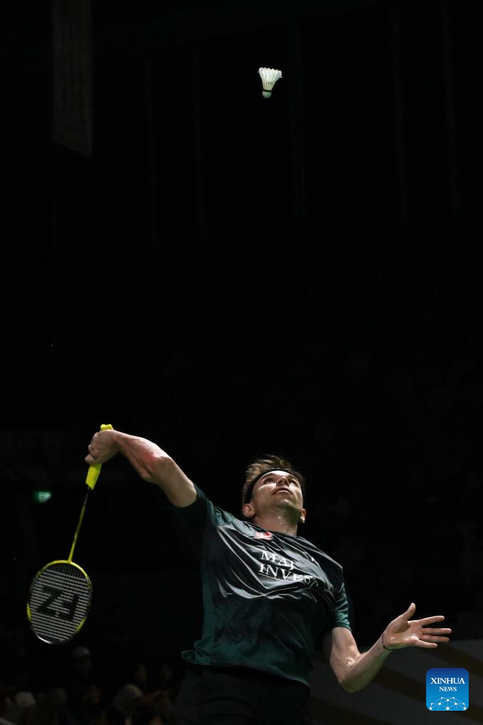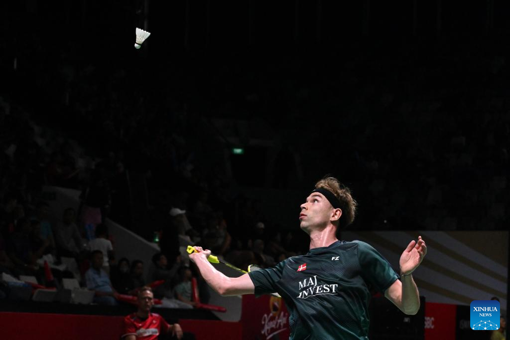 Rasmus Gemke hits a return during the men's singles first round match between Rasmus Gemke of Denmark and Naraoka Kodai of Japan at 2024 Indonesia Open badminton tournament in Jakarta, Indonesia, June 5, 2024. (Xinhua/Veri Sanovri)