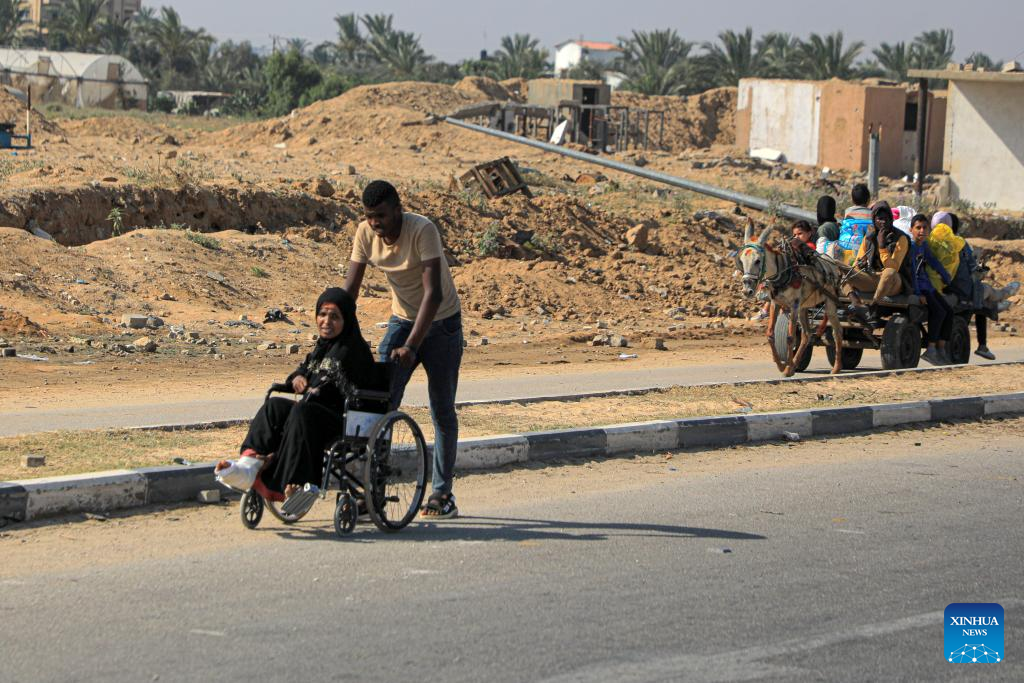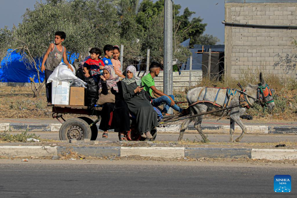Displaced Palestinians flee from the Bureij and Maghazi refugee camps in the central Gaza Strip, on June 5, 2024. Israeli fighter jets targeted Hamas positions in the Bureij refugee camp in central Gaza, with ground forces simultaneously operating in the area based on intelligence, Israeli military spokesperson Avichay Adraee said on Tuesday. (Photo by Rizek Abdeljawad/Xinhua)