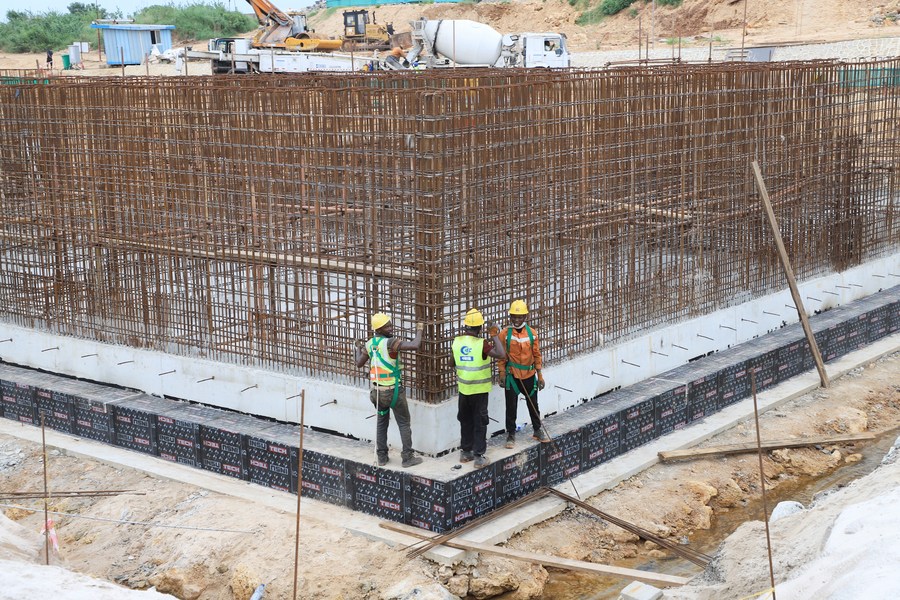 This photo, taken on April 16, 2024, shows workers operating at the construction site of Tanzania's first-ever fishing harbor in Kilwa Masoko in Lindi, Tanzania. (Xinhua/Hua Hongli)