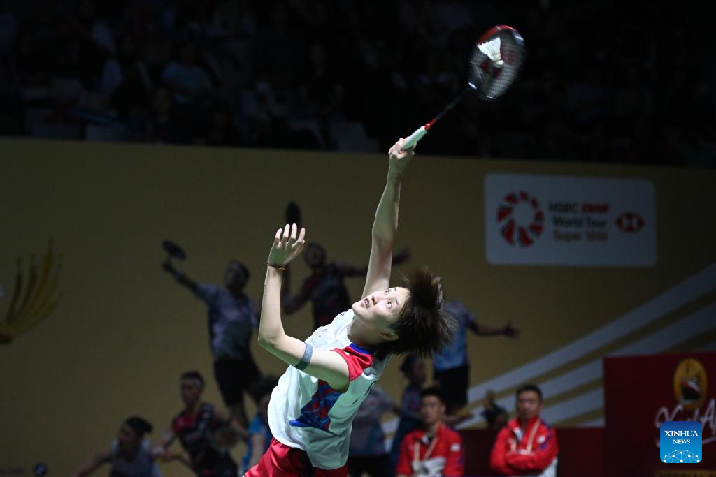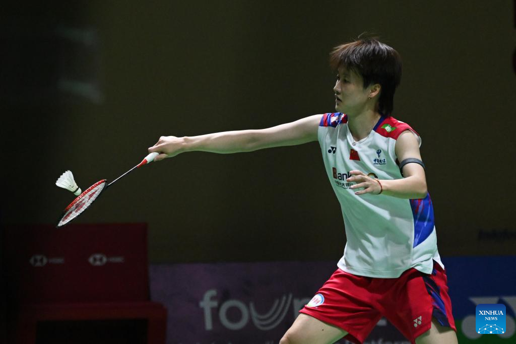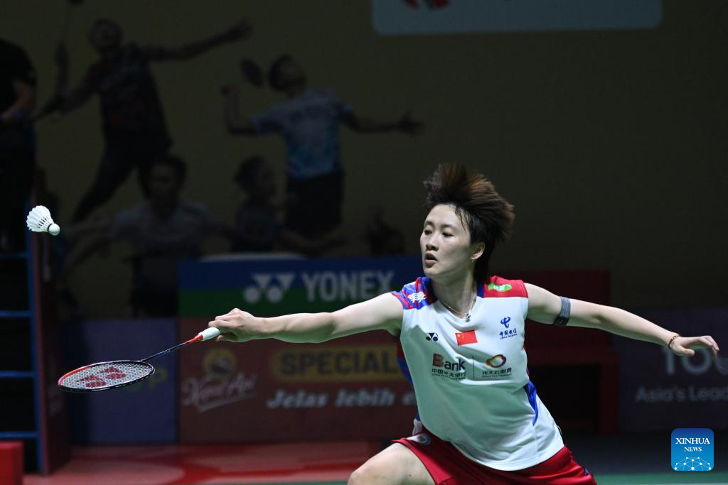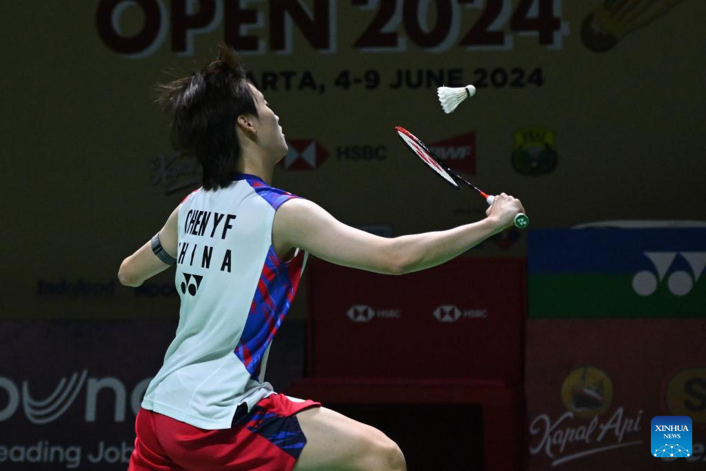 Chen Yufei hits a return during the women's singles second round match between Chen Yufei of China and Ohori Aya of Japan at 2024 Indonesia Open badminton tournament in Jakarta, Indonesia, June 6, 2024. (Xinhua/Veri Sanovri)