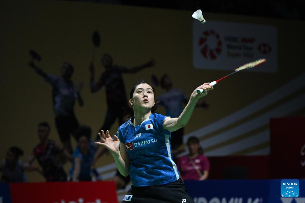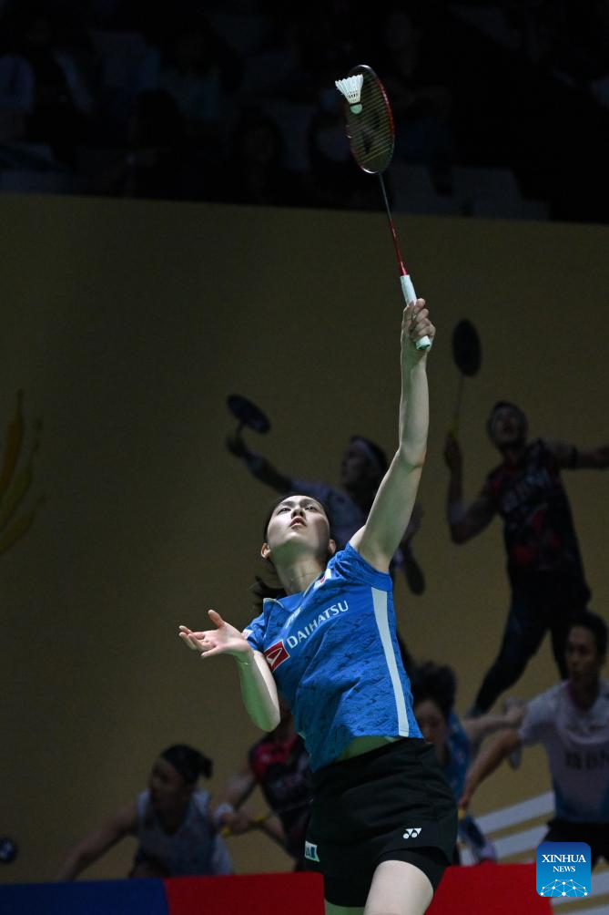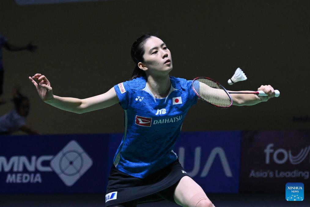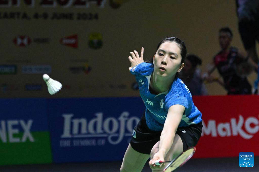 Ohori Aya hits a return during the women's singles second round match between Chen Yufei of China and Ohori Aya of Japan at 2024 Indonesia Open badminton tournament in Jakarta, Indonesia, June 6, 2024. (Xinhua/Veri Sanovri)