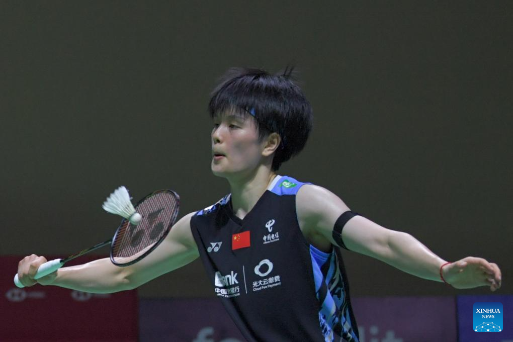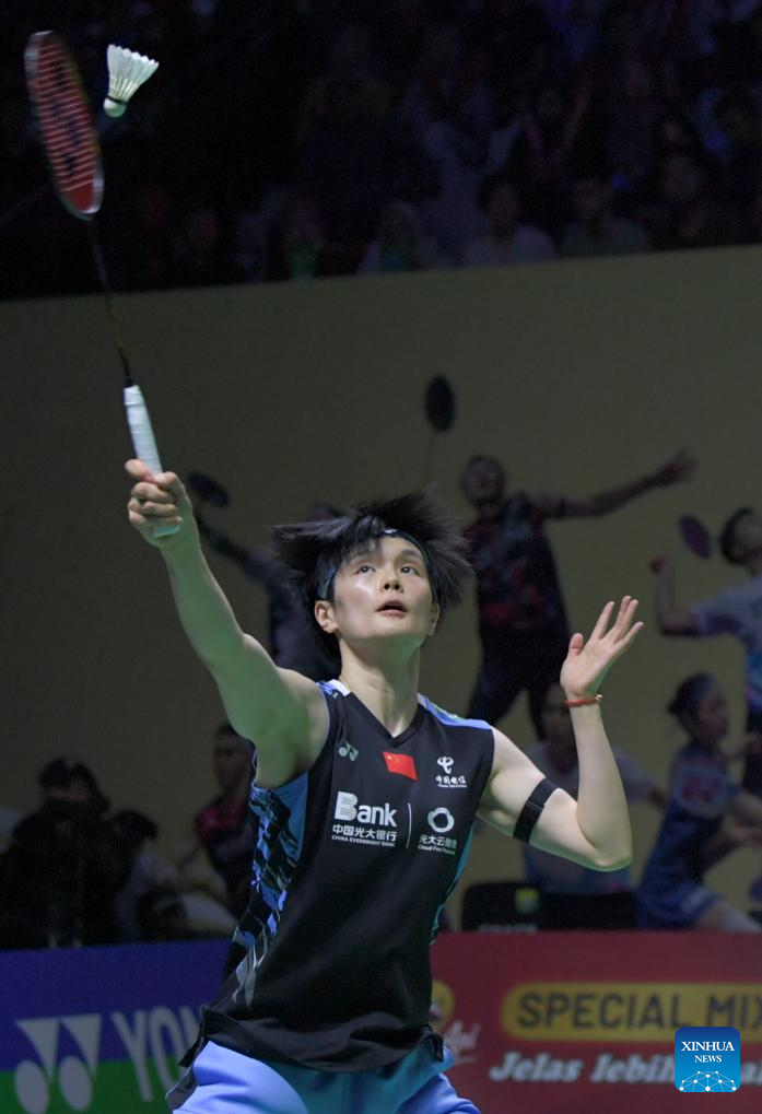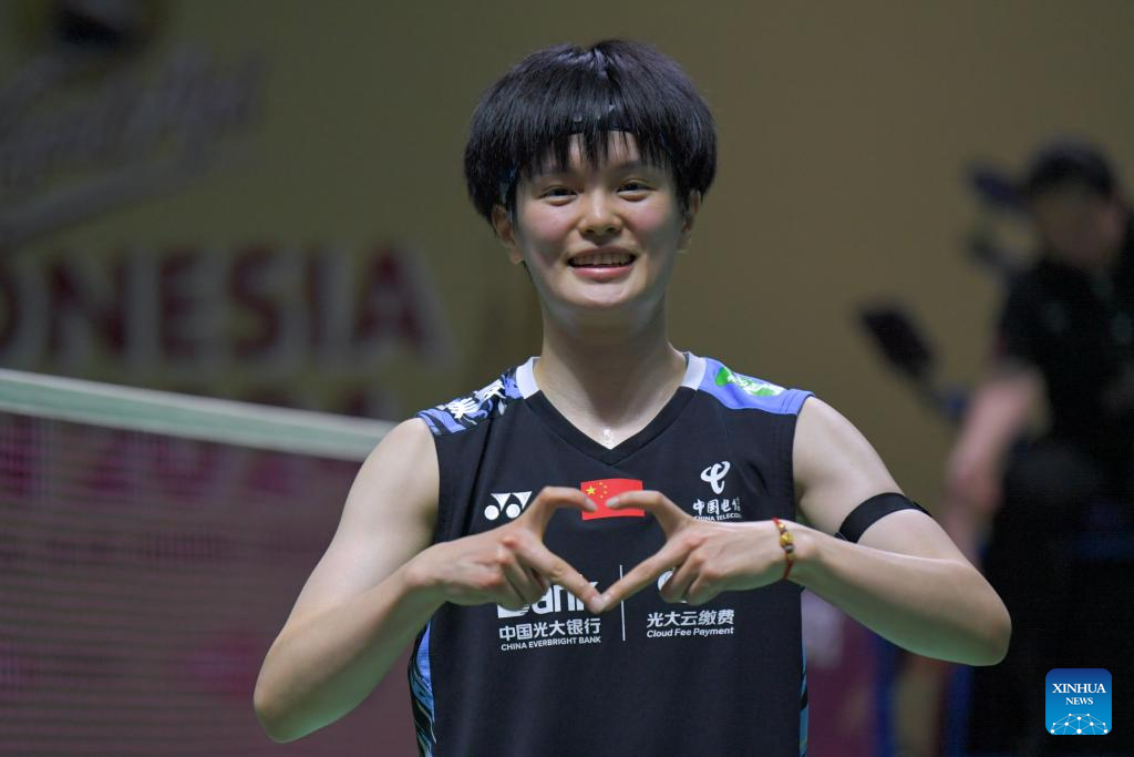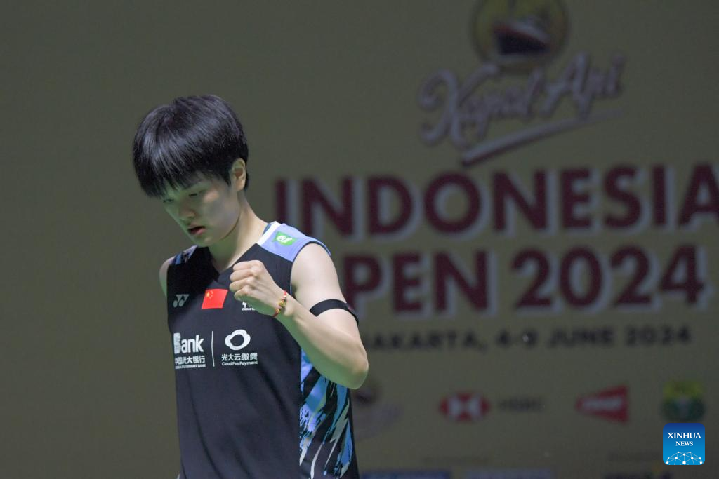 Wang Zhiyi reacts during the women's singles second round match between Wang Zhiyi of China and Ester Nurumi Tri Wardoyo of Indonesia at 2024 Indonesia Open badminton tournament in Jakarta, Indonesia, June 6, 2024. (Xinhua/Xu Qin)