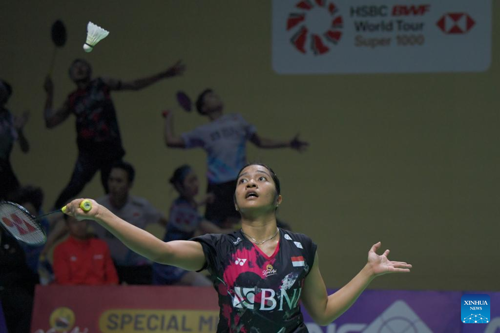 Ester Nurumi Tri Wardoyo hits a return during the women's singles second round match between Wang Zhiyi of China and Ester Nurumi Tri Wardoyo of Indonesia at 2024 Indonesia Open badminton tournament in Jakarta, Indonesia, June 6, 2024. (Xinhua/Xu Qin)