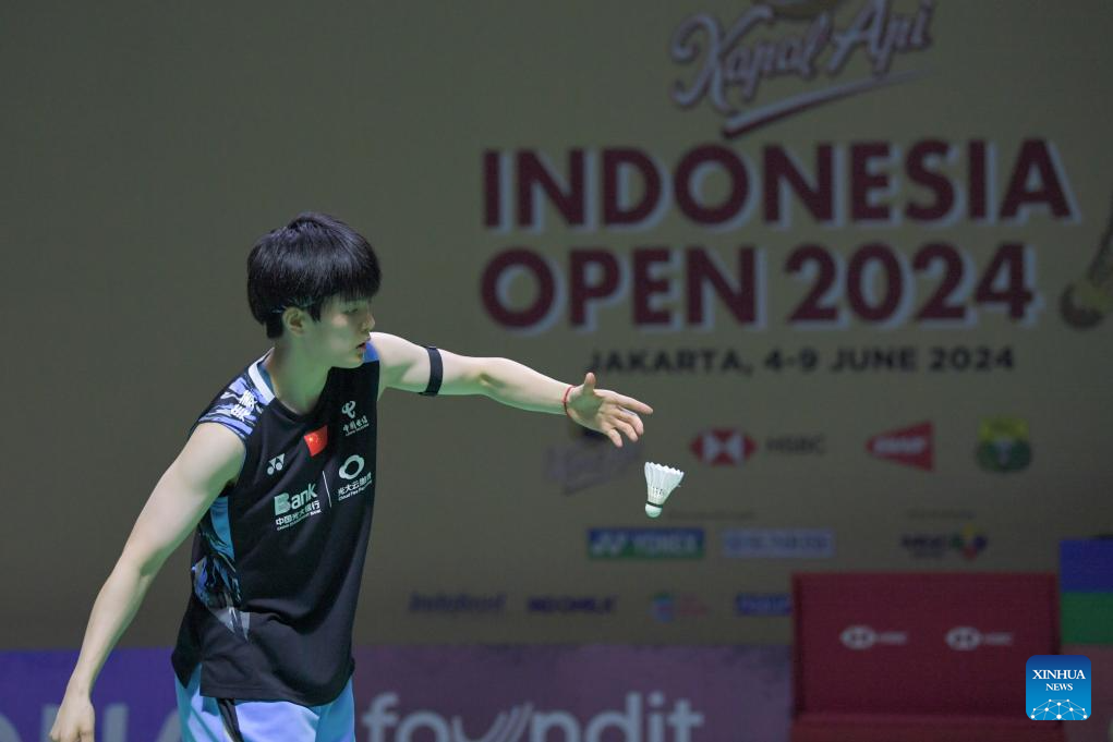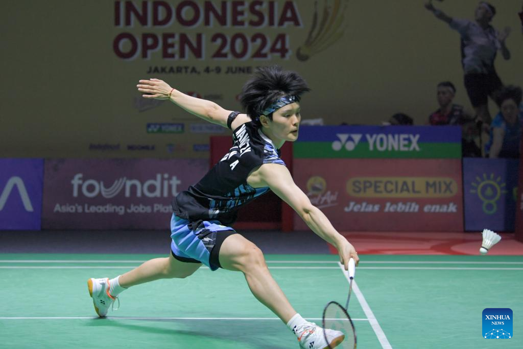 Wang Zhiyi hits a return during the women's singles second round match between Wang Zhiyi of China and Ester Nurumi Tri Wardoyo of Indonesia at 2024 Indonesia Open badminton tournament in Jakarta, Indonesia, June 6, 2024. (Xinhua/Xu Qin)