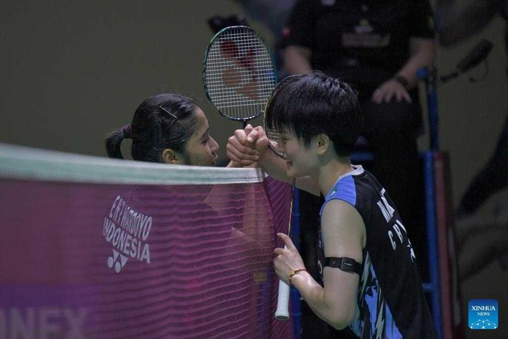Wang Zhiyi(R) of China shakes hand with Ester Nurumi Tri Wardoyo of Indonesia after the women's singles second round match between Wang Zhiyi of China and Ester Nurumi Tri Wardoyo of Indonesia at 2024 Indonesia Open badminton tournament in Jakarta, Indonesia, June 6, 2024. (Xinhua/Xu Qin)