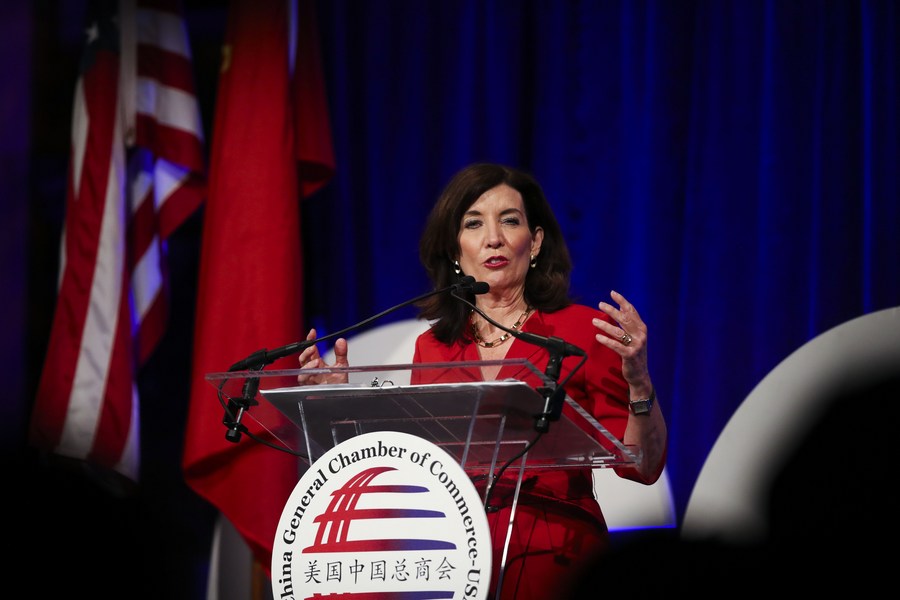 New York Governor Kathy Hochul speaks during the annual New Year gala of the China General Chamber of Commerce-USA (CGCC-USA) in New York, the United States, Feb. 22. 2022. (Xinhua/Wang Ying)