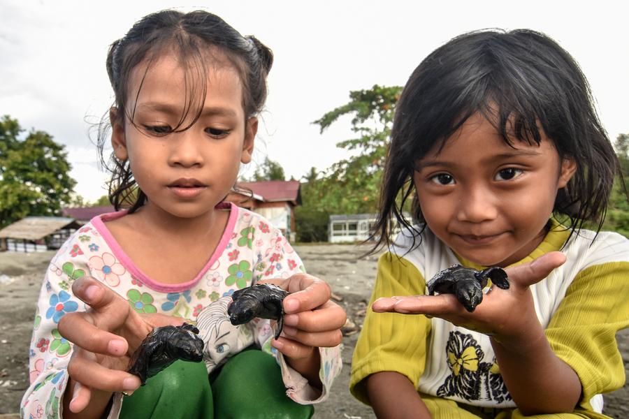 CENTRAL SULAWESI, Indonesia, June 6 (Xinhua) -- People happily said goodbye to baby hawksbill sea turtles before releasing them into the sea on the occasion of World Environment Day in Donggala regency, Central Sulawesi, Indonesia.