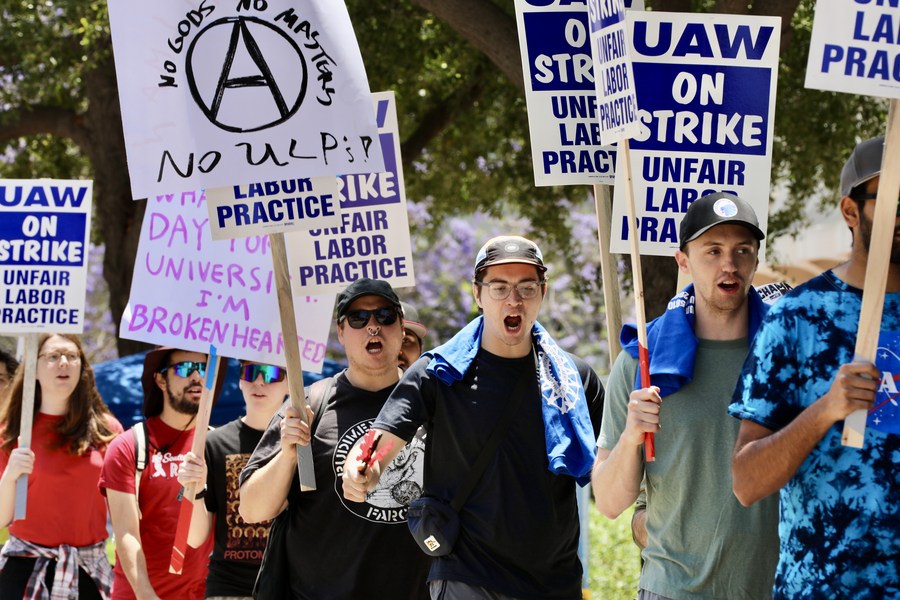 Academic workers protest at the University of California (UC), Irvine in Orange County, California, the United States, on June 5, 2024. (Photo by Zeng Hui/Xinhua)