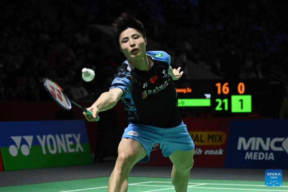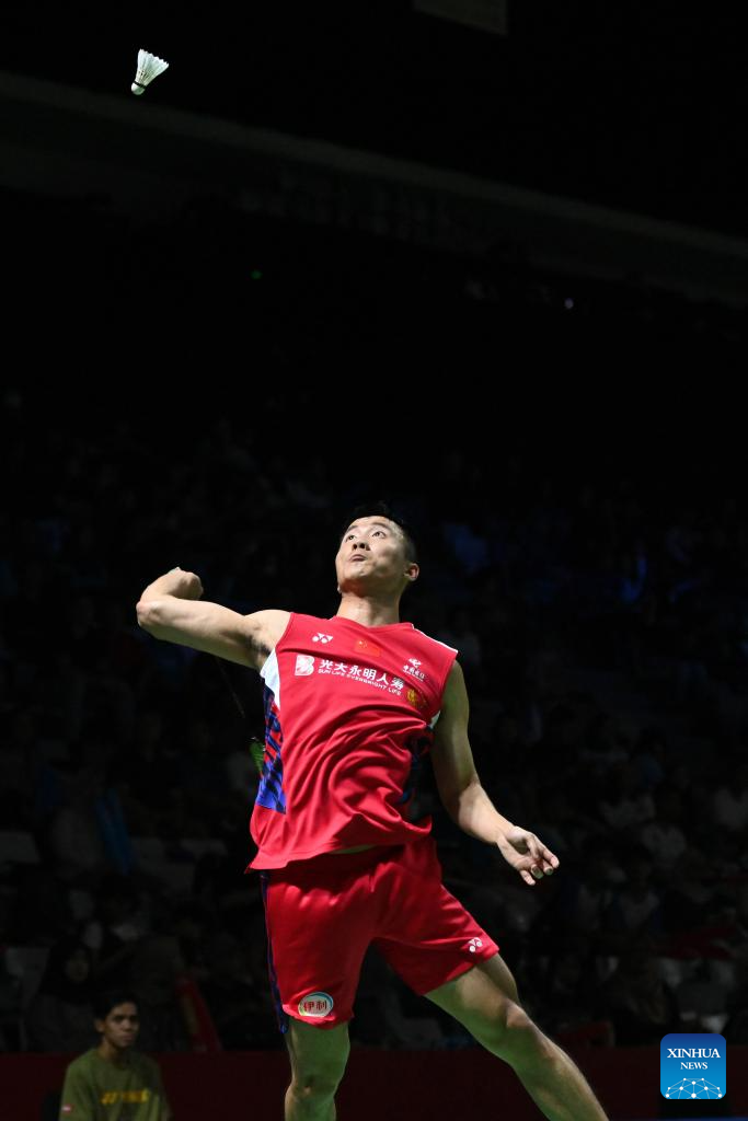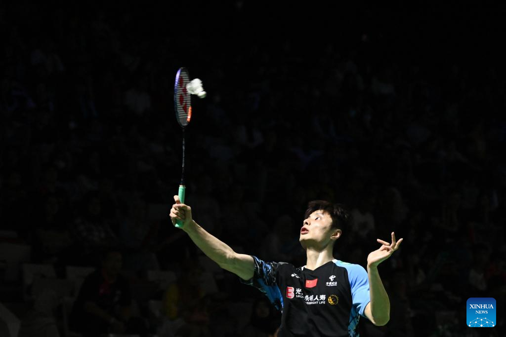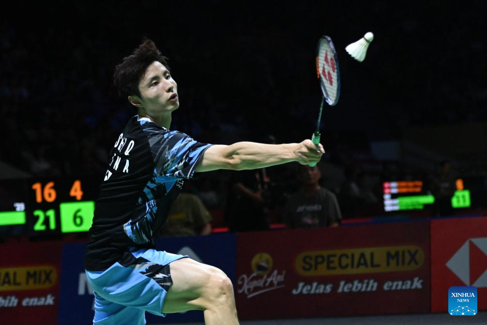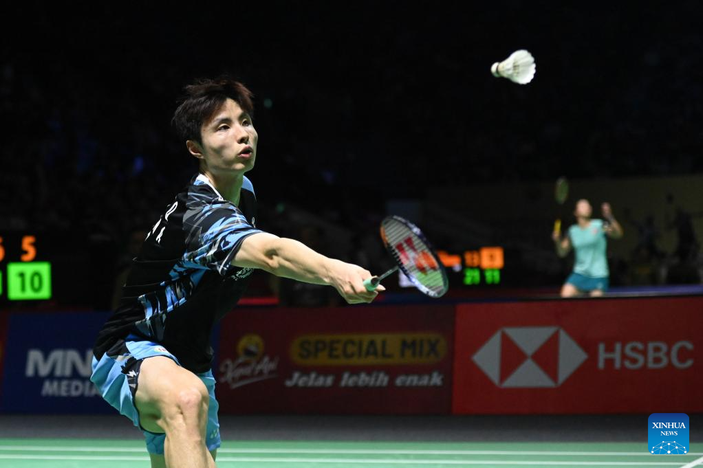 Shi Yuqi hits a return during the men's singles second round match between Shi Yuqi of China and his teammate Lu Guangzu at 2024 Indonesia Open badminton tournament in Jakarta, Indonesia, June 6, 2024. (Xinhua/Veri Sanovri)