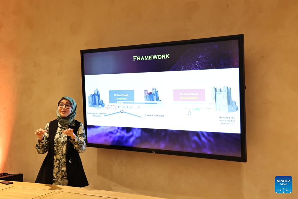 A student introduces a project of applying the AI technology to the restoration of buildings during the first African high-level forum on Artificial Intelligence (AI) at the Mohammed VI Polytechnic University of Morocco in Sale, Morocco, on June 4, 2024. The first African high-level forum on Artificial Intelligence (AI) wrapped on Wednesday in Sale, northwestern Morocco, with reaching the "Rabat Consensus" on AI application in Africa. (Xinhua/Huo Jing)